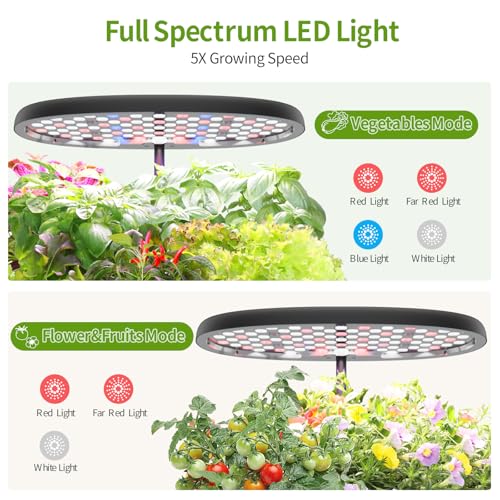 4 CHOICES IN 2 GROWING MODES: Our indoor smart hydroponics garden, with its full-spectrum lights that simulate natural sunlight, not only can you easily adjust the illumination distance, but you can also choose from two growing modes – veggies mode and flower&fruit mode, each with two light durations, meet the light needs of various plants.