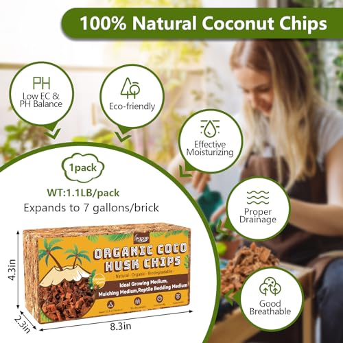 Legigo 1.1 LB Coco Husk Chips for Plants- 100% Organic Coconut Coir Chips Brick with Low EC & PH Balance, Compressed Coconut Substrate Coco Chips Mulch Medium for Garden, Flowers, Plants