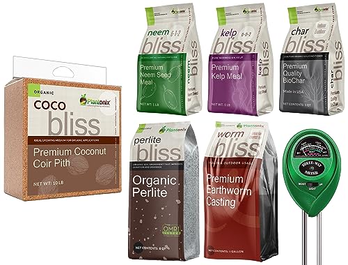 Coco Bliss Coco Coir + Organic Perlite + Worm Castings + Neem Meal Fertilizer + Kelp Meal Fertilizer + Organic Biochar for Plants – Potting Soil & Fertilizer Mix for Plants – Organic Gardening Bundle