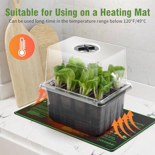【Sturdy Materials & Reusable】:The seedling starter trays are made of quality thickened plastic, which are durable and not easy to deform. Premium PP material makes our seed starter tray stronger than cheep PVC tray, also better to control the inside temperature and protect the plants in the tray. In addition, our seed starting tray is compatible with a heating mat that operates at a temperature range of 0~120℉.