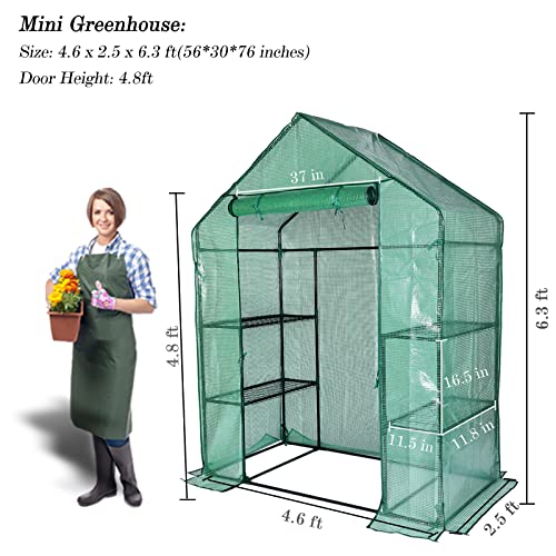 MINI GREENHOUSE LARGE SPACE: This 3-Tier small walk-in greenhouse is 56 inch long, 30 inch wide, and 76 inch high. The door is 5.25ft high,so adults can enter and exit easily. Floor 1 and 2 are 16.5 inch high and 11.5 inch wide. Each shelf space allows about a dozen plant pots at once.