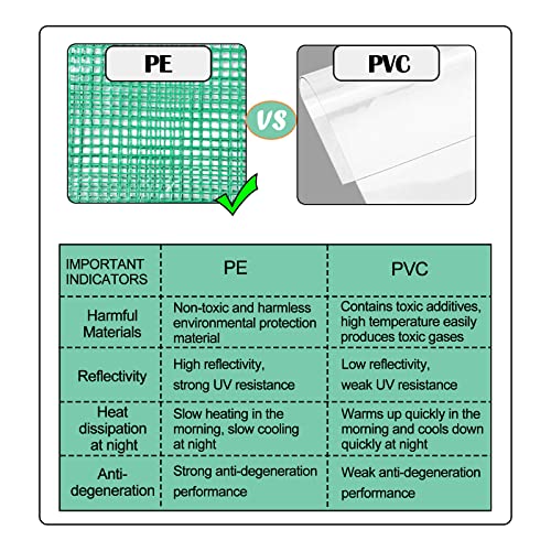 ECO-FRIENDLY PE COVER: PE green cover is odorless, non-toxic, low-temperature resistance, acid, alkali corrosion resistance, aging resistance. lets in a lot of heat but doesn’t burn the seedlings as the clear covers have done.