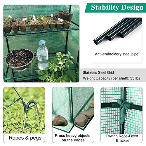 【Strong structure】 The sturdy steel pipes are the main support of portable greenhouses. Constructed with 4 heavy-duty bearing shelves. Per shelf could hold 50 lbs enough to hold more plant pots. Comes with ropes and anchors, which will securely fix the hothouse to the ground to add stability in case the storm blows them away.