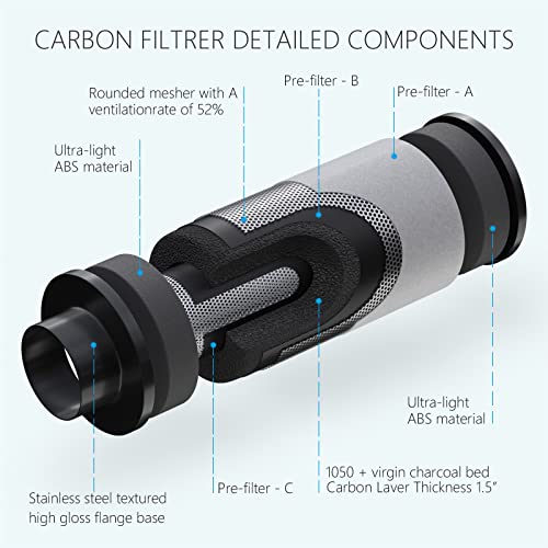 ☼4″ Ventilation Kit: 1.5” Layer Coal Based activated carbon used for the filter,inline fan has 190CFM high air flow, 4″φ 25FT ducting included with 3 Clamps. Eliminate most undesirable odors, pungent smell and particulates from indoor grow tent, hydroponics grow room(Effective Odor Control)