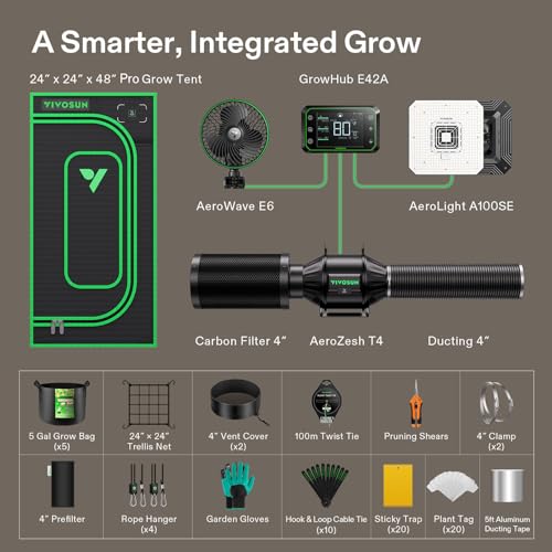Complete Plus Kit Included: 24″x24″x48″ PRO Grow Tent; AeroLight A100SE 100W LED Grow Light; AeroZesh T4 4″ Duct Fan; AeroWave E6 Clip Fan; GrowHub E42A Controller; 4″ Carbon Filter; 4″ Prefilter; 4″ 8ft Ducting; 4″ Clamp×2; 24”×24” Trellis Net; 5 Gal Grow Bag×5; 4″ Vent Cover×2; Pruning Shears; 100m Twist Tie; Sticky Trap×20; Plant Tag×20; Hook & Loop Cable Tie×10; 5ft Aluminum Ducting Tape; Garden Gloves; Rope Hanger×4