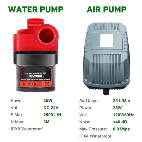 【POWERFUL AIR PUMP & WATER PUMP】25L/min strong air output provides ample oxygen to the root via air stone; 800L/H water flow, which is more efficient and more water-saving to grow larger, healthier root systems of plants