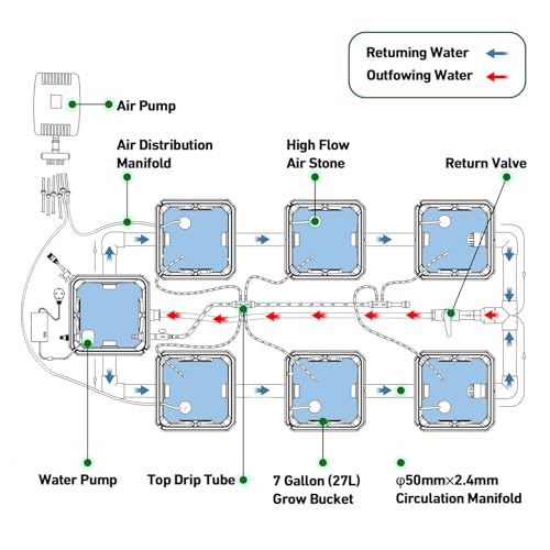 【6 BUCKETS + 1 RESERVOIR COMPLETE RDWC KIT】6 x Growing Buckets, 1 x Reservoir, 1 x Air Pump, 1 x Water Pump, 7 x Air Stones, 6 x Top Drip Irrigation Kit, 1x Water Level Indicator, 6 Packs Clay Pebbles, 1x Instruction and other needed install accessories. The package contains everything you require for a complete hydroponics grow system!