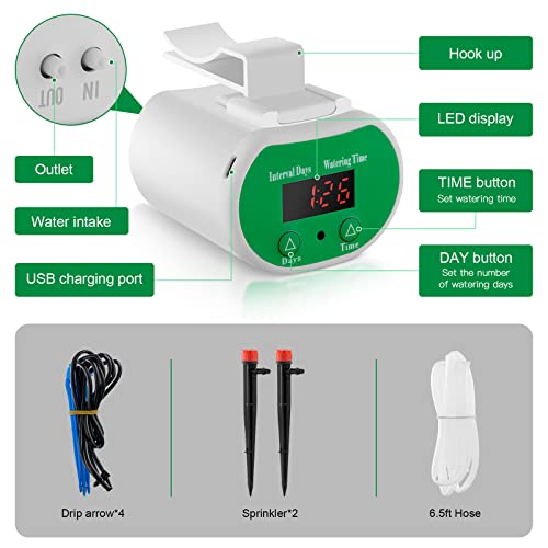 AUTOMATIC PLANT WATERING EQUIPMENT INCLUDES: The package includes 6.5ft hose, drip arrow x4, tee connector x1, sprinkler x1, usb charging cable x1. Note: Avoid siphoning, the water source/bucket/water surface height should not be higher than the water pump.